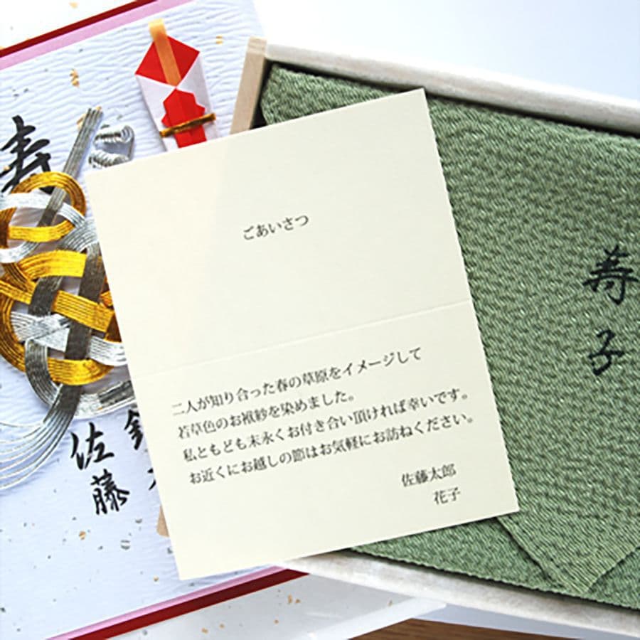 このたびは、ふたりの門出をお祝いいただき誠にありがとうございました。ささやかではございますが、ふたりの感謝の気持ちとして丹後ちりめんのお袱紗をお贈り致します。まだまだ未熟な二人ですが今後とも末永くご指導のほどよろしくお願い申し上げます。